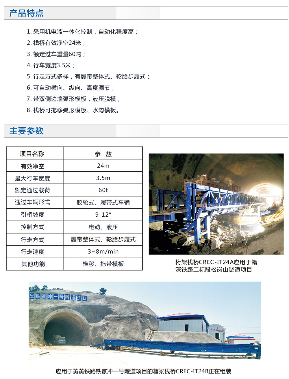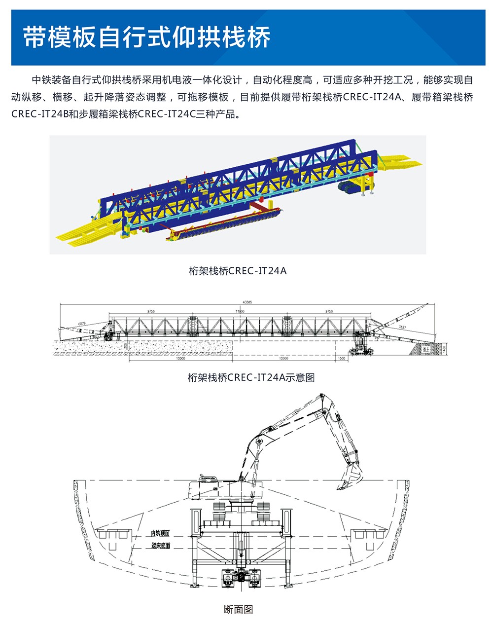 中鐵裝備自行式仰拱棧橋采用機電液一體化設計,自動化程度高,可適應多種開挖工況,能夠實現自動縱移、橫移、起升降落姿態調整,可拖移模板,目前提供履帶桁架棧橋CREC-IT24A、履帶箱梁棧橋CREC-IT24B和步履箱梁棧橋CREC-IT24C三種產品。